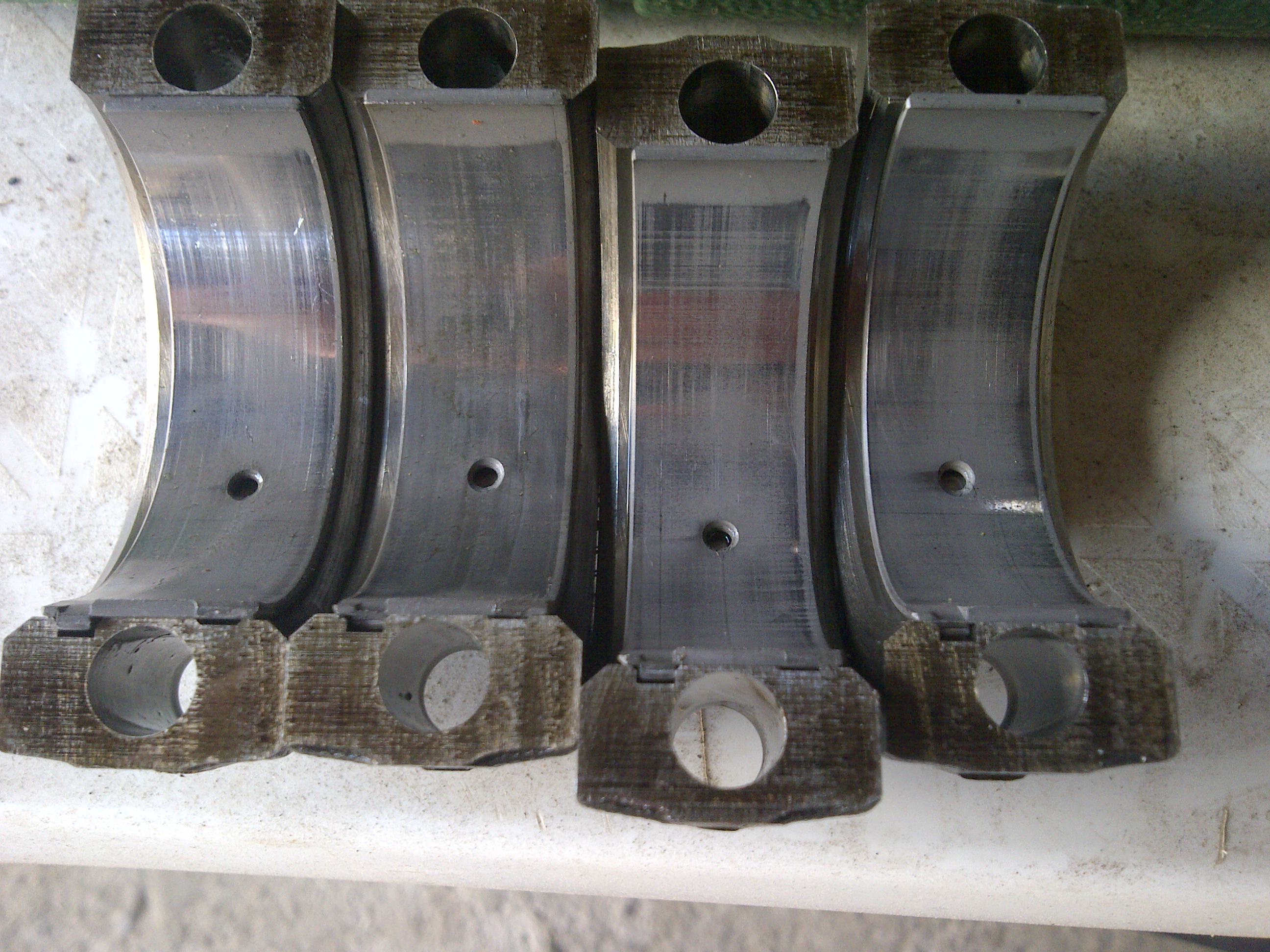 The one at the right looks a bit worse In this pic notice the middle main is upside down. There is the oppisite side that had to be in the block, amaizingly not much damage or ware?? The bigends looks a bit more worked than the mains I think. Opinions??