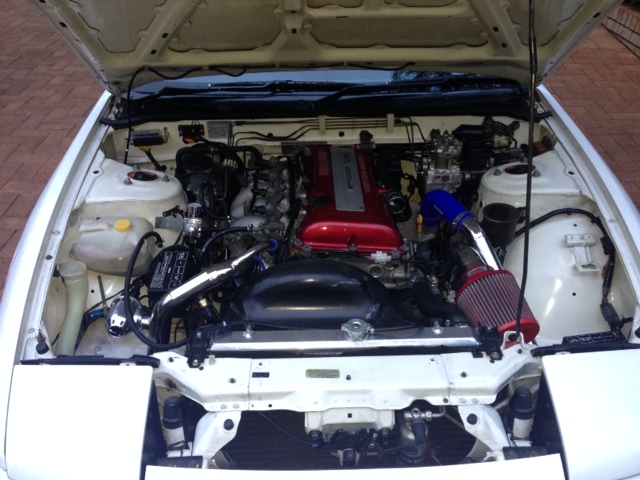 I've cleaned up the engine bay a bit with the power sprayer. Also installed OEM radiator fan cowling from a S15.