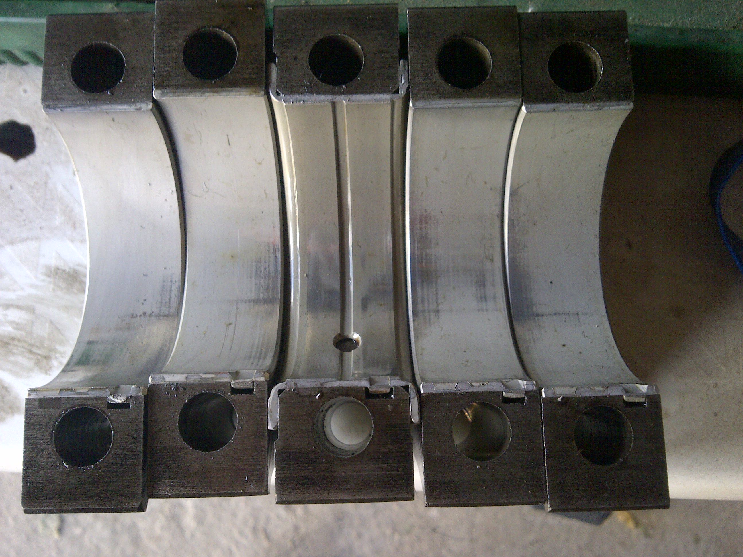 The one at the right looks a bit worse In this pic notice the middle main is upside down. There is the oppisite side that had to be in the block, amaizingly not much damage or ware?? The bigends looks a bit more worked than the mains I think. Opinions??