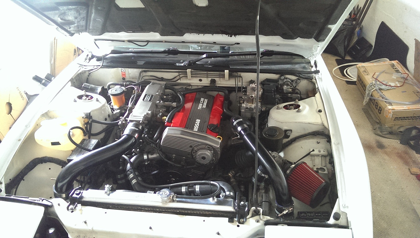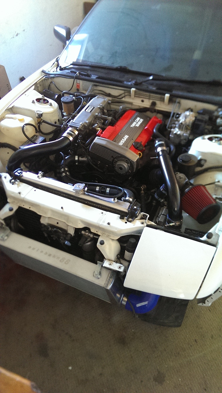 A complete rebuild followed, with a few added improvements. This is a 80% done pic , I also added some gauges (not pictured is my AEM wideband on the A-pillar) Here's a competed engine bay pic as she stands now. I stared her last week and drove her in nice